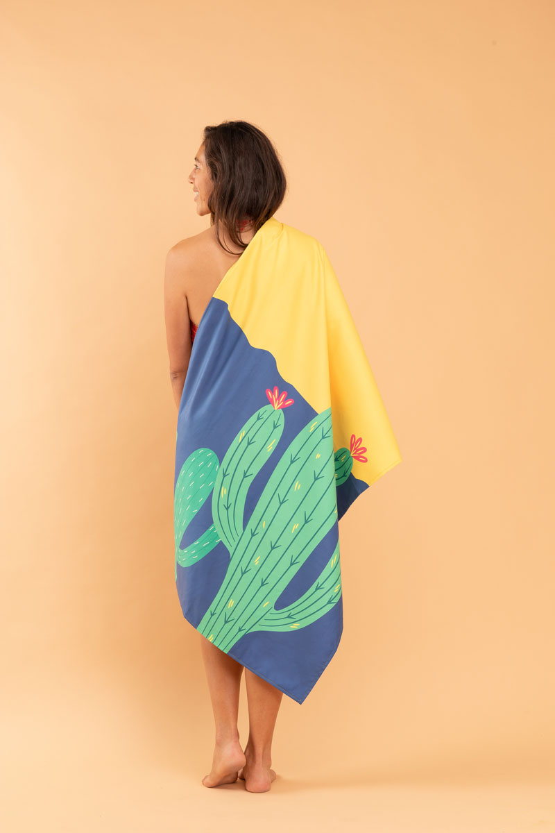 Toalla Cacti, elaborada en microfibra de alta calidad con poliéster reciclado, suave al tacto, liviana y de secado rápido. Ideal para la playa, la piscina o actividades deportivas, gracias a su alta absorción y fácil transporte. Su diseño compacto permite llevarla cómodamente a cualquier lugar, ofreciendo practicidad y comodidad en cada uso.