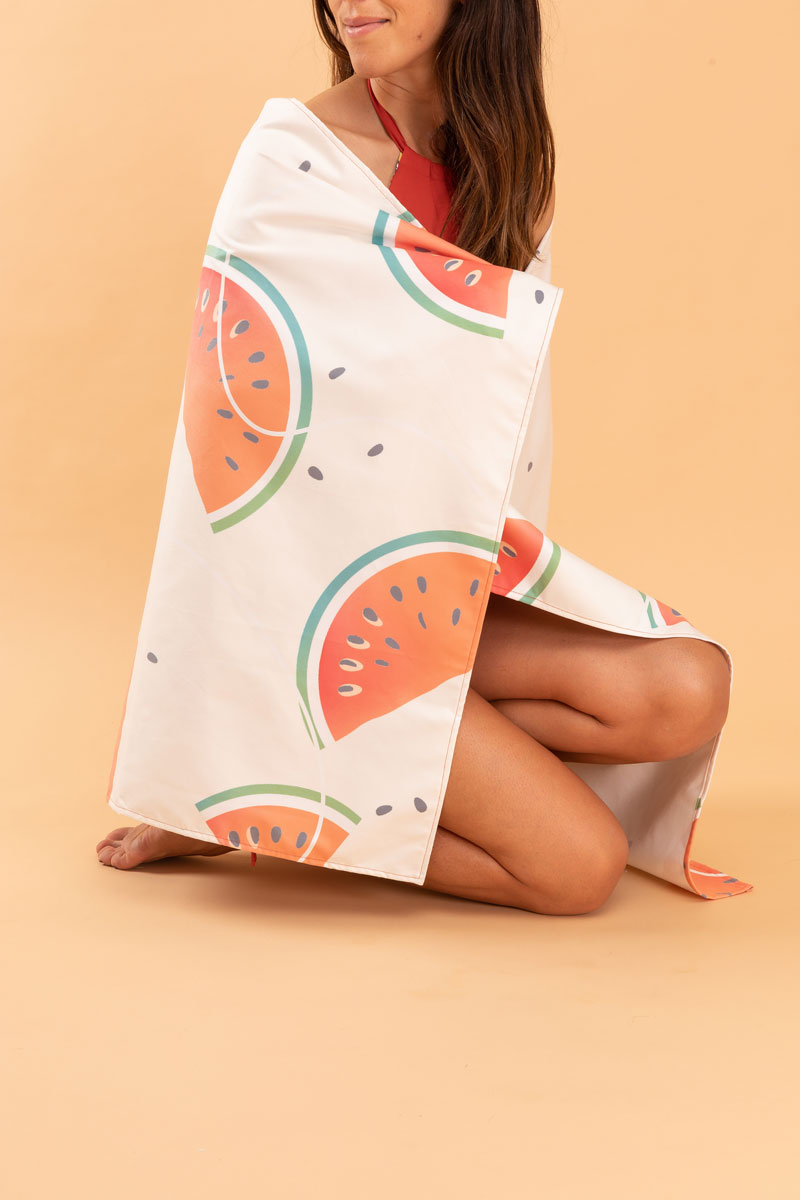 Toalla Sandía, elaborada en microfibra de alta calidad con poliéster reciclado, suave al tacto, liviana y de secado rápido. Ideal para la playa, la piscina o actividades deportivas, gracias a su alta absorción y fácil transporte. Su diseño compacto permite llevarla cómodamente a cualquier lugar, ofreciendo practicidad y comodidad en cada uso.